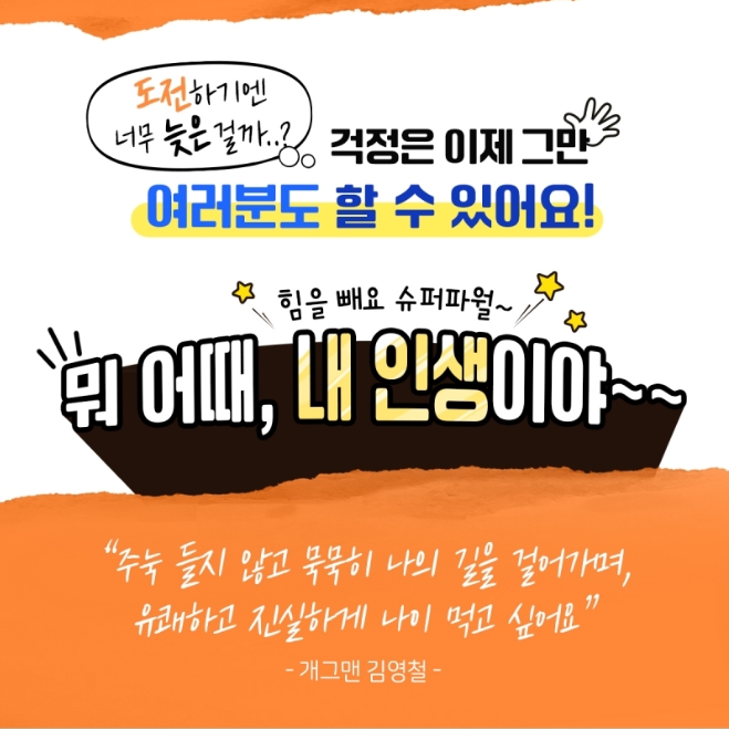 누구보다 열정적인 삶을 살아온 김영철이 말하는 인생 이야기, 그리고 유쾌한 감동. 지금 이 순간, 웃음과 위로가 절실하다면 아래 버튼을 눌러 신청하세요!