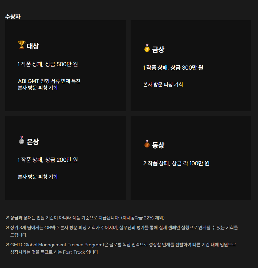 - 지원 방법: 오비맥주 공식 홈페이지 → 공모전 페이지 접수