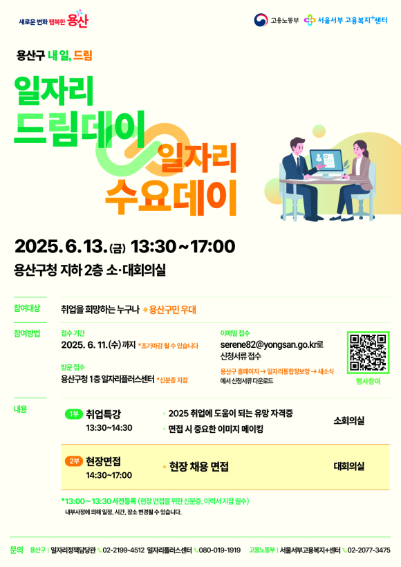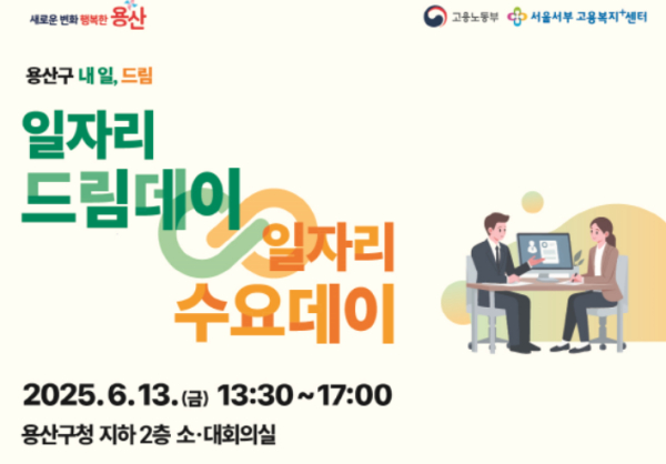 서울 용산구는 6월 13일(목) 오후 1시 30분부터 ‘일자리 드림데이∞수요데이’ 행사를 개최합니다.