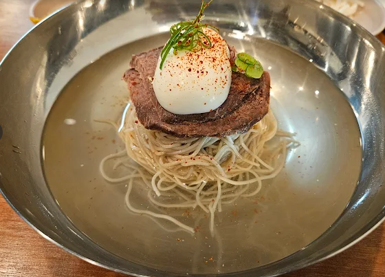 옥돌현옥의 평양냉면은 100% 메밀로 만든 면발이 부드럽고 고소하며, 육수는 진한 육향과 적절한 간이 어우러져 평양냉면 초보자도 부담 없이 즐길 수 있습니다.