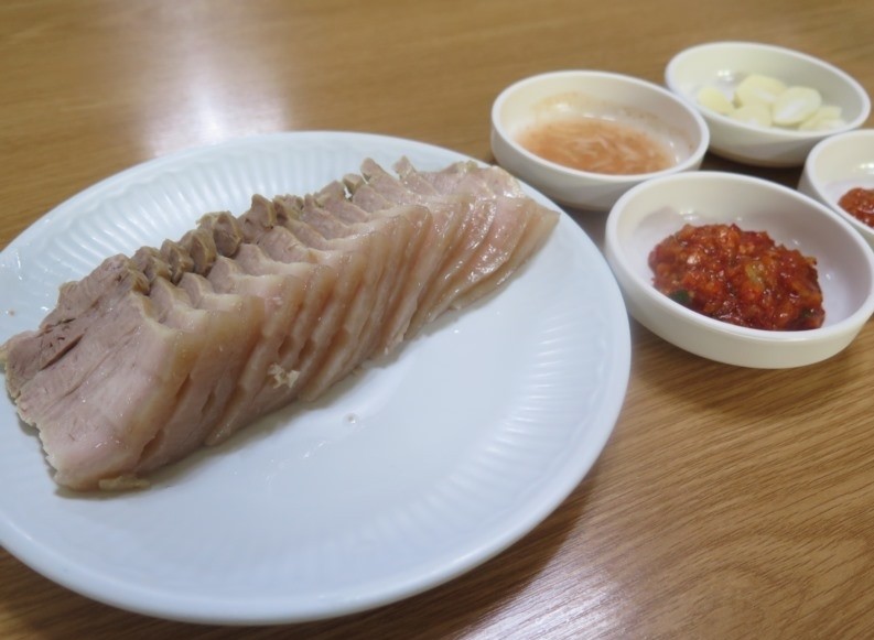 "제육은 쫀득하고 부드러워서, 특제 새우젓에 찍어 먹으면 최고입니다. 평양냉면과 제육은 세트입니다."