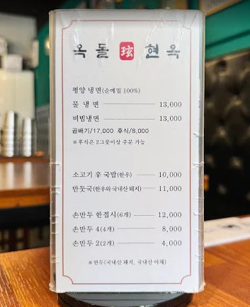 옥돌현옥은 평양냉면 외에도 곰탕, 어복쟁반, 손만두 등 다양한 메뉴를 제공하며, 매장 내부는 앤티크한 인테리어로 가족 단위 손님들도 편안하게 식사할 수 있는 공간입니다.
