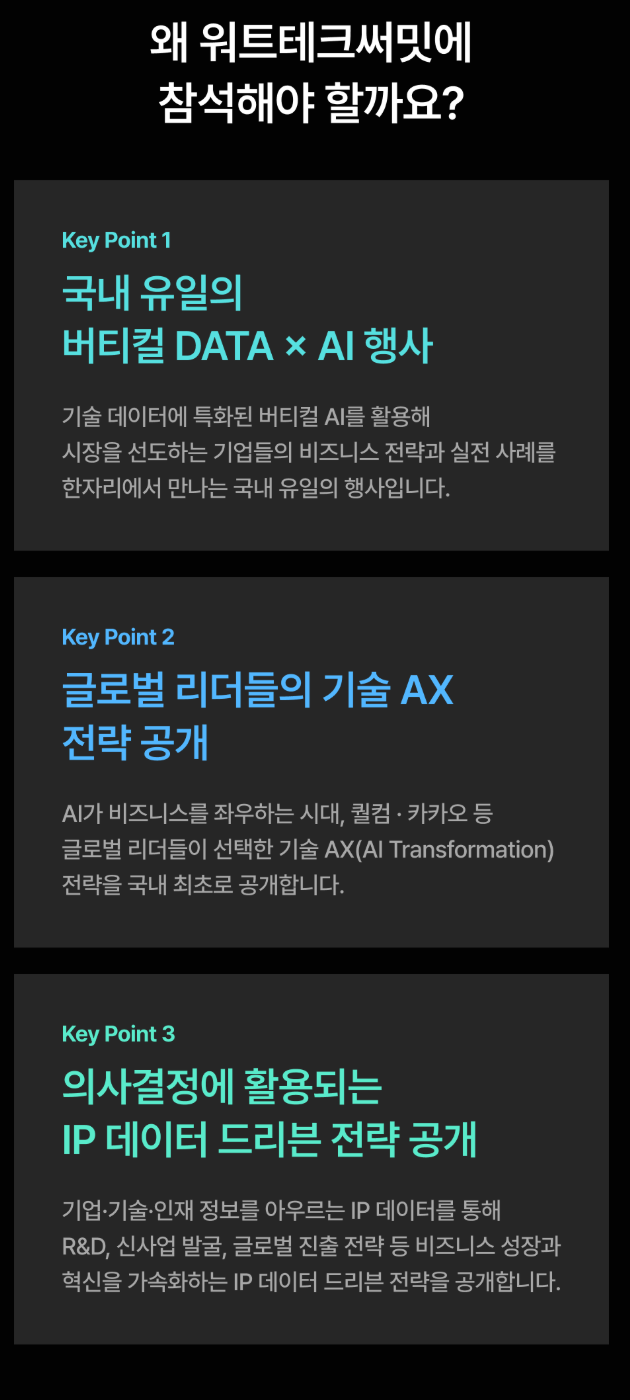 특히 이번 행사는 무료이며, 오프라인과 웨비나로 동시 운영돼 시간과 장소의 제약 없이 참여할 수 있습니다. AI 기반 특허 빅데이터 혁신을 이끄는 워트인텔리전스가 주최하는 만큼 기술의 깊이와 실용성이 기대되는 자리입니다.