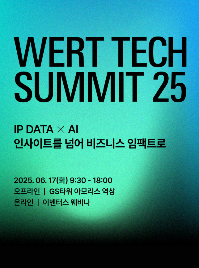 기술과 비즈니스 전략의 최전선을 마주하고 싶다면, 단 하루! ‘WERT TECH Summit 25’는 반드시 주목해야 할 자리입니다. IP데이터, AI, 버티컬AI 등 산업에 혁신을 일으키는 기술들이 실제 비즈니스에 어떻게 적용되고 있는지를 인사이트 있게 만나볼 수 있는 컨퍼런스입니다.